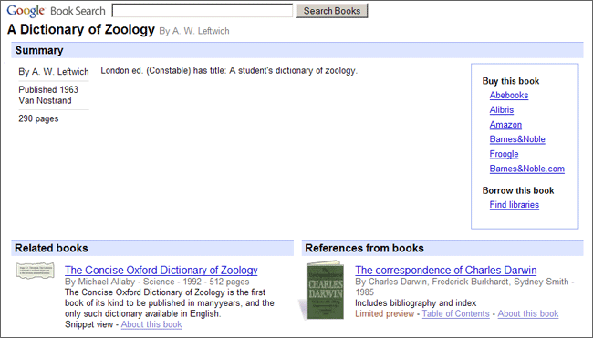 Google ブックスページにアクセスすると、どのような画面が表示されますか全体表示 | 限定プレビュー | スニペット表示 | プレビューを利用できません 各書籍には、タイトル、著者名、出版日、ページ数、テーマなどの基本的な書籍データが記載されている [この書籍について] ページが含まれます。書籍によっては、主要な用語やフレーズ、書籍を引用するほかの学術記述、章題、関連書籍一覧などの追加情報が記載されています。書籍ごとに、その書籍を購入できる書店と、借りることができる図書館へのリンクが表示されます。 著作権が失効している場合、または出版社もしくは著者の許可がある場合は、[全体表示] で書籍をご覧いただけます。全体表示では書籍のすべてのページを閲覧でき、公共利用できる書籍であれば PDF 形式でダウンロード、保存および印刷して読むことができます。 出版社もしくは著者の許可がある場合は、書籍の数ページをご覧いただけます。 [スニペット表示] では、図書カード カタログのような書籍の情報とともに、書籍の抜粋、つまり検索用語を含む文章の一部が表示されます。 図書カード カタログなどの書籍の基本情報をご覧いただけます。 |